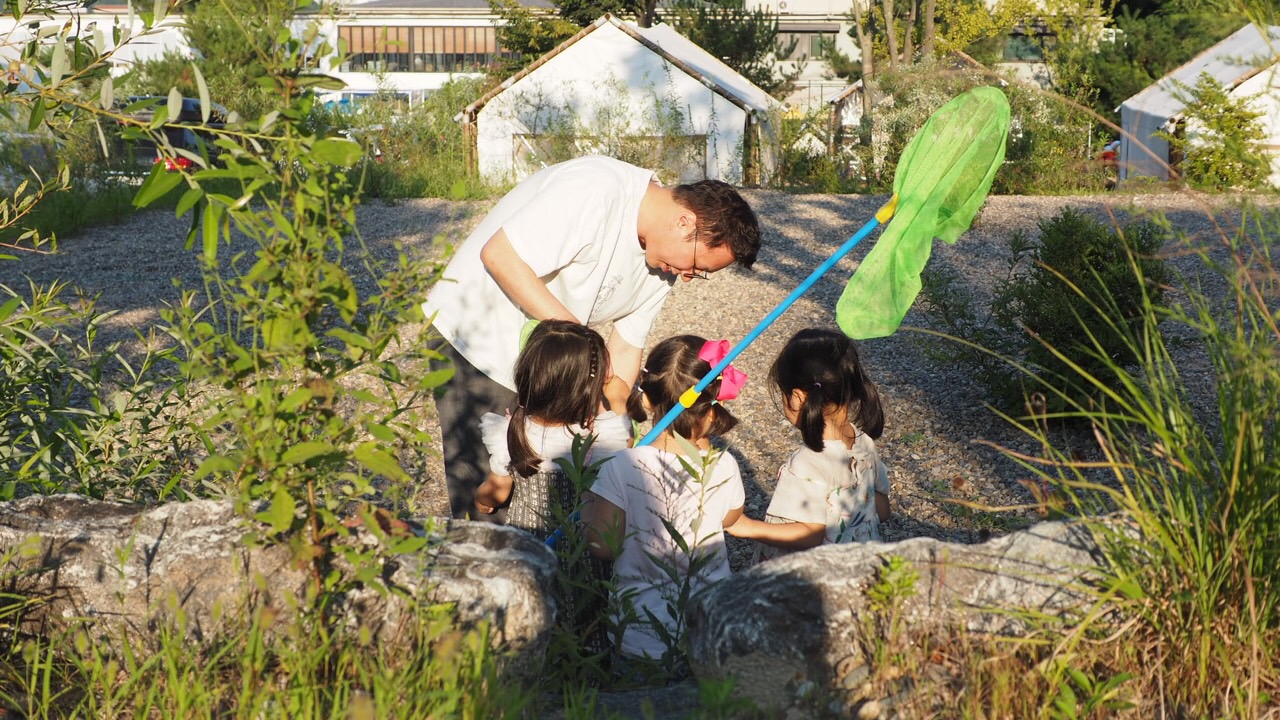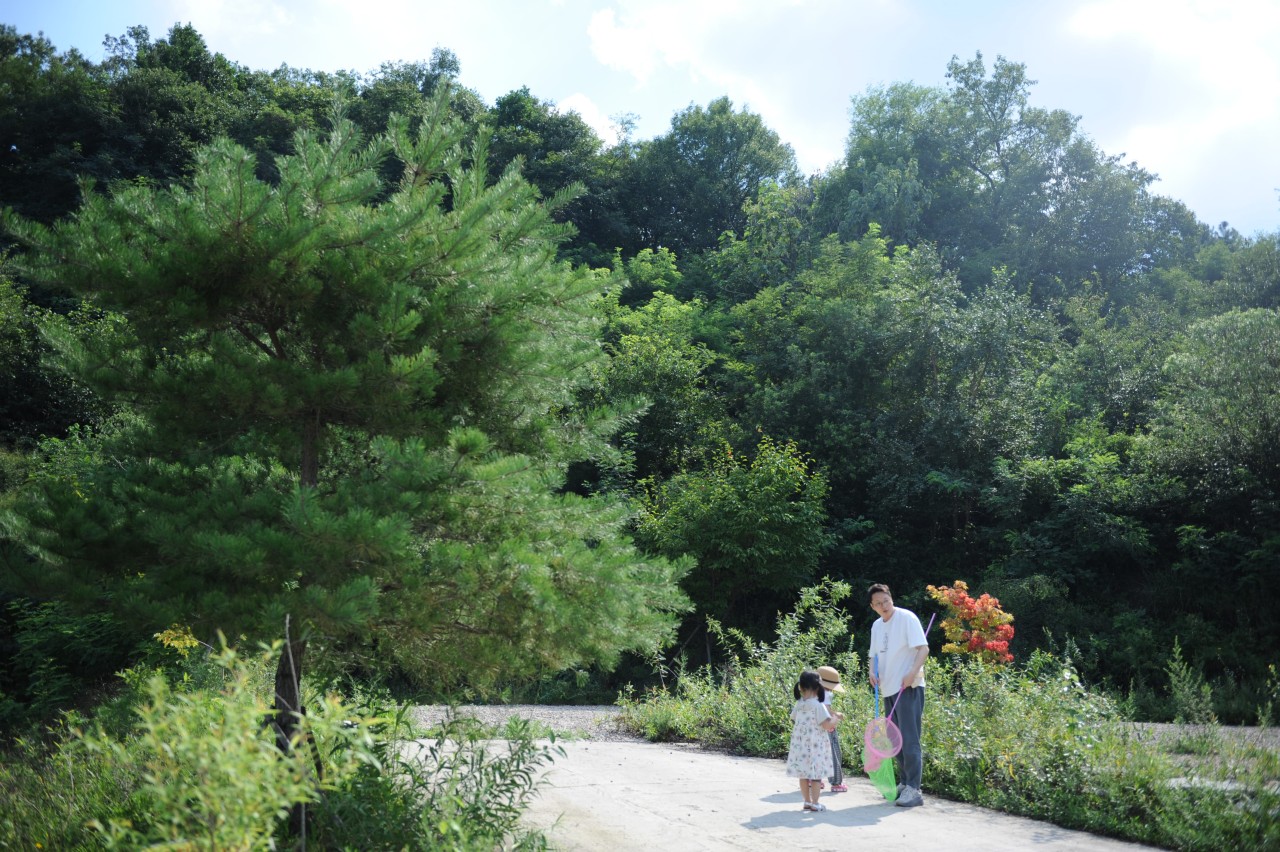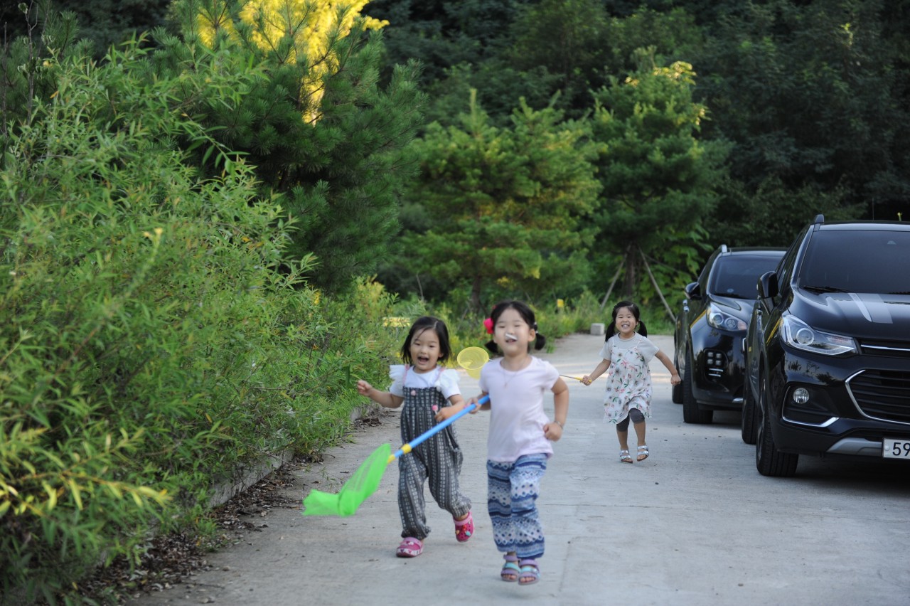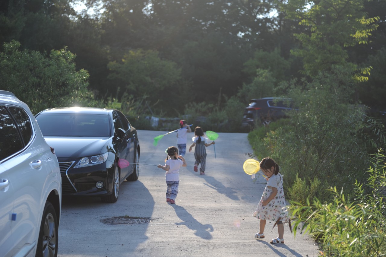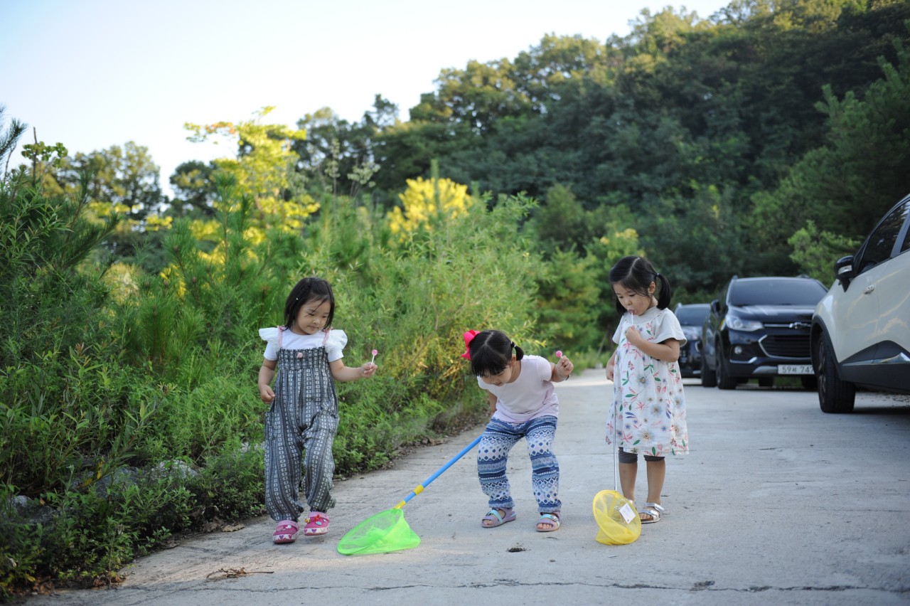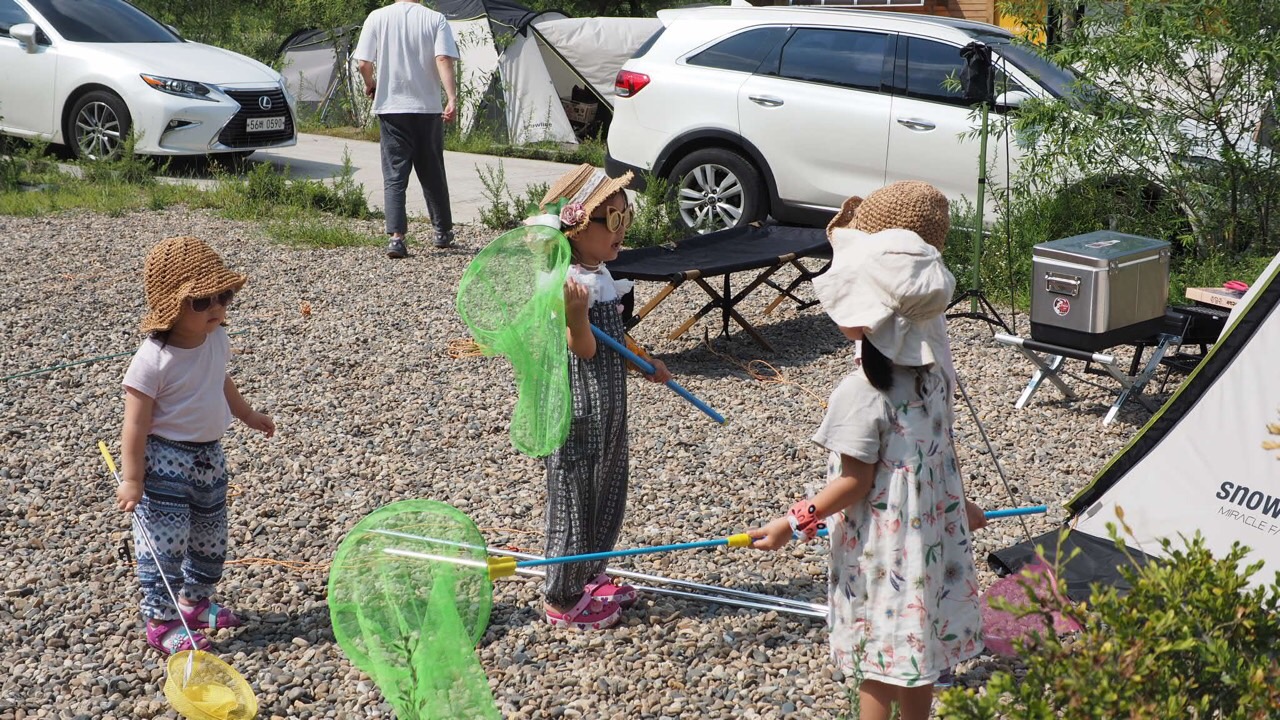 잠자리채 하나씩 쥐어 아빠들하고 내보내니,