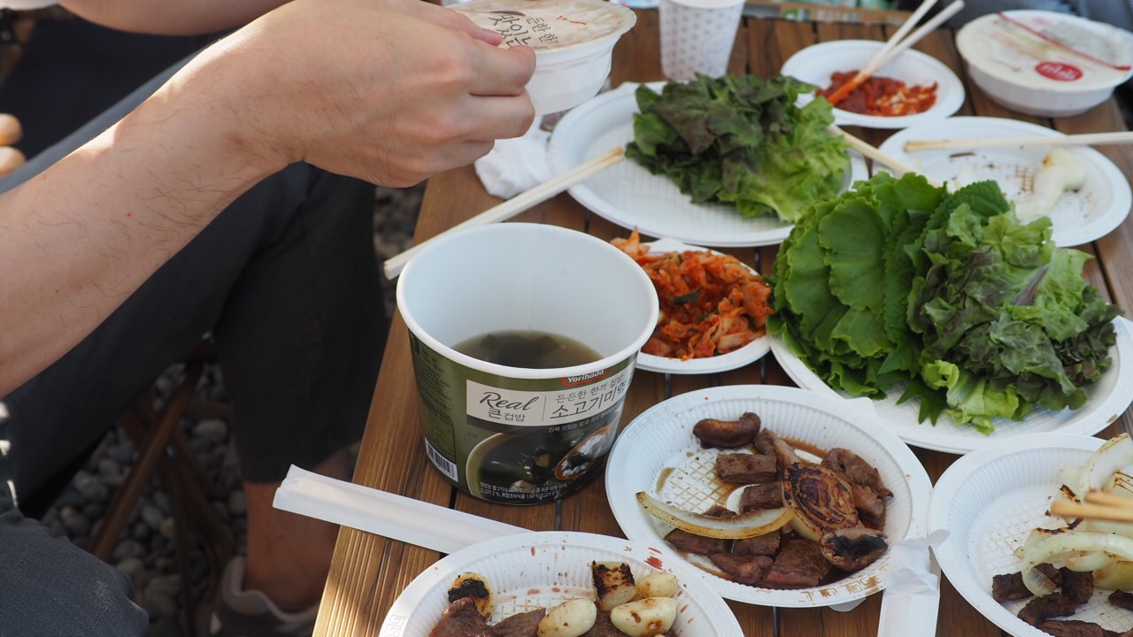 당일 글램핑은 숯불이 아니라 불판에 굽는 고기가 옵션이다.
